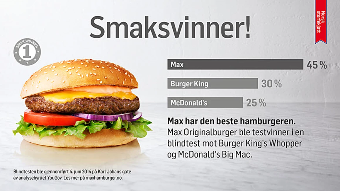 Max Hamburgerrestauranter AS utfordret denne uken McDonalds’ storselger Big Mac og Burger Kings Whopper til en offisiell burger-test på Egertorget i Oslo. Analysebyrået YouGov bistod med å gjennomføre testen, hvor tilfeldig forbipasserende ble bedt om å smake på de tre ulike burgerne, uten å få vite hvilken burger som tilhørte hvilken hamburgerkjede. Når 160 burgere var fortært stod Max igjen som den klare vinneren.